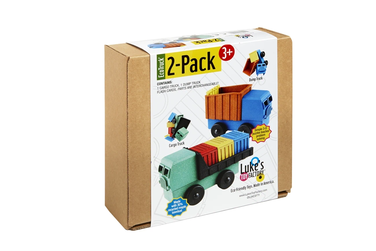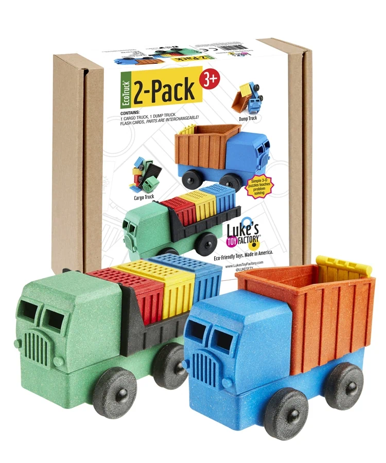 סט משאיות צעצוע בר קיימא עם חלקים להרכבה התואמים להחלפה בין המשאיות .תוצרת 100% ארה"ב מנסורת עץ ופוליפרופילן ממוחזר . מוצר זוכה פרסים . צעצוע לימודי מאתגר